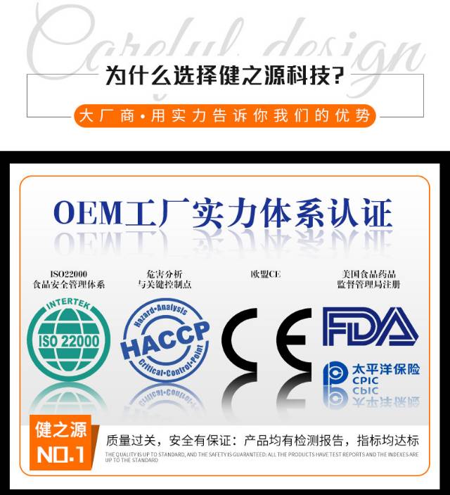六、在代加工产品生产前,中,后采用OEM贴牌厂家成熟严谨的质检程序,三次检验,保证产品质量。原料入场前,通过第三方检测以及厂检后方可入厂。生产前对原料进行筛选,生产中各环节进行抽样检查。产品包装检测,成品检测等等。